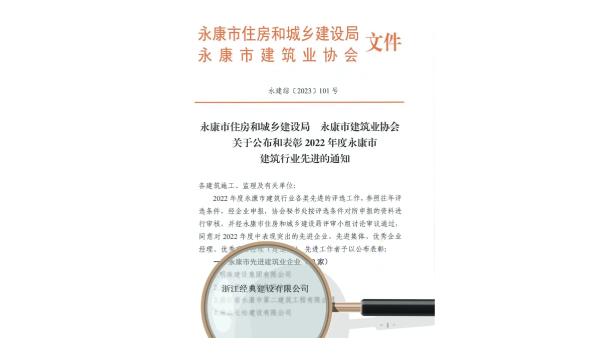 喜報!經(jīng)典建設(shè)榮獲“2022年度永康市先進(jìn)建筑業(yè)企業(yè)”多項榮譽(yù)